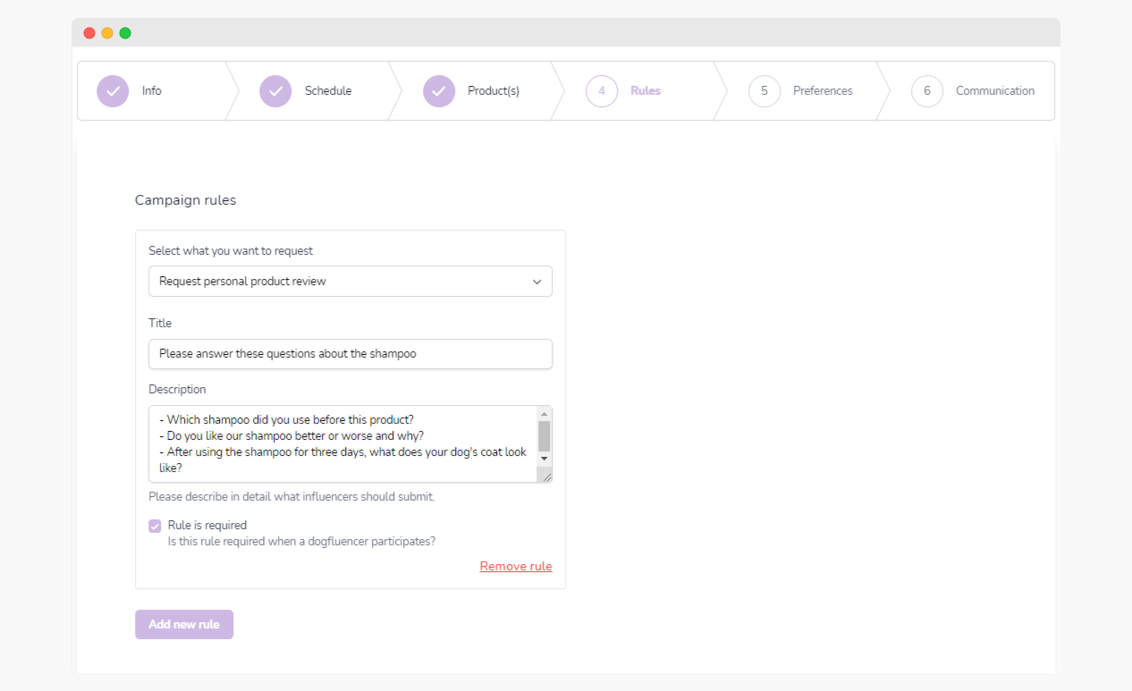 It's super easy. It only takes a few minutes. Just create a new campaign here. Schedule your campaign, select the product and set promotional rules that dogfluencers must meet in order to participate.