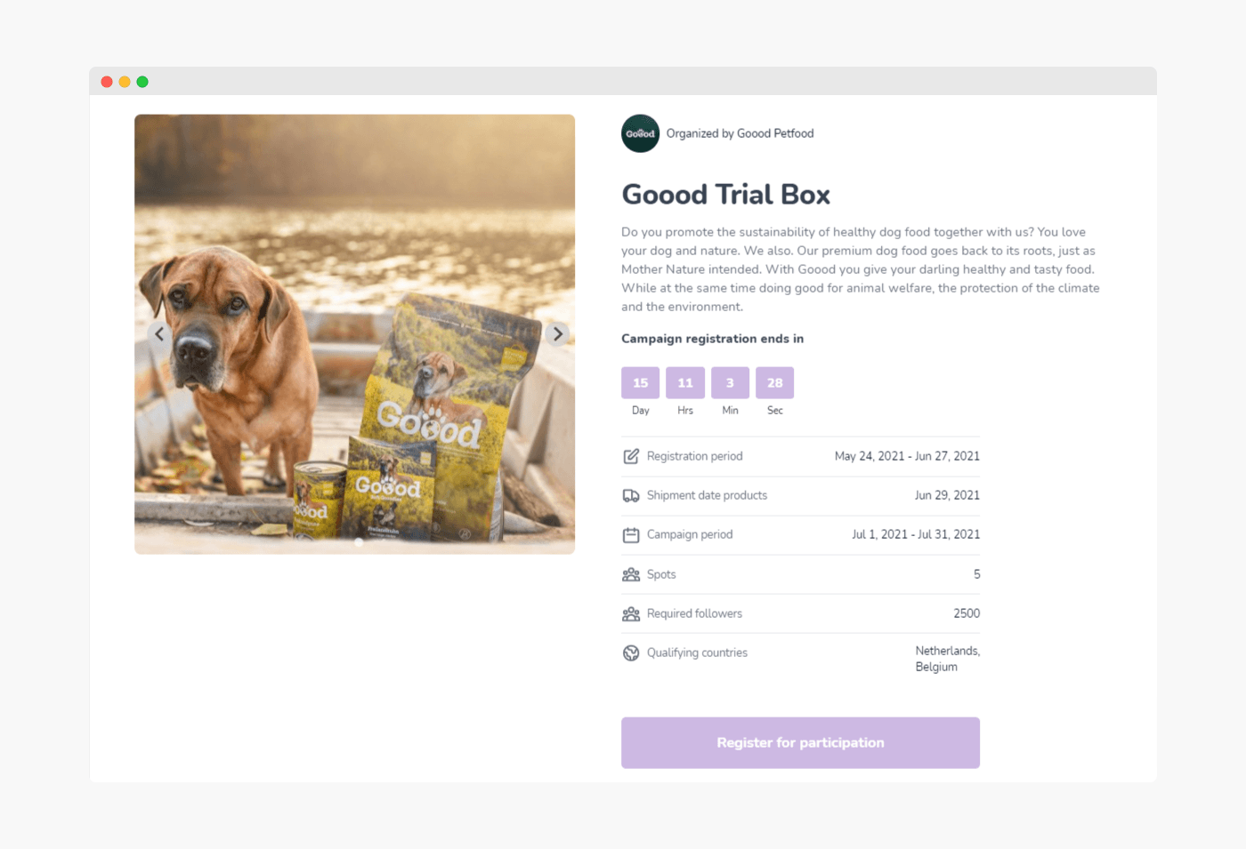 Create a new campaign here. As a brand, you decide what incentives you offer. At the moment of writing, it is only possible to sponsor dogfluencers with 'free' products, but we will soon enable brands to offer a cash reward as well.