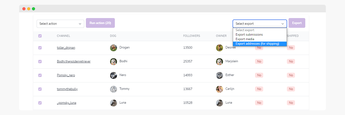 Easily export addresses of dogfluencers to ship your products to your doggy testing squad.