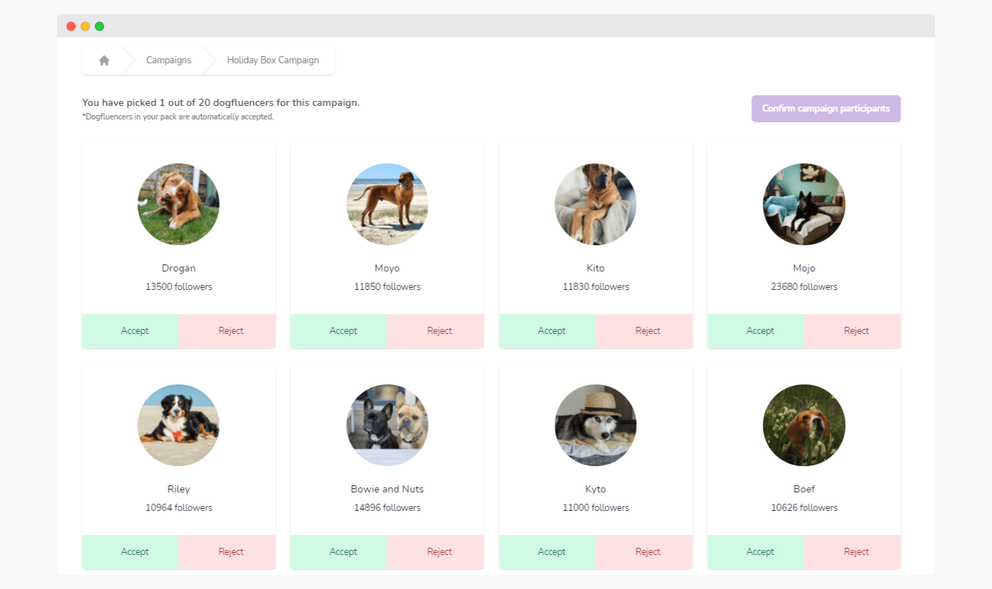 Once your product test campaign registration period ends, you can choose the dogfluencers you want to work with for this campaign.